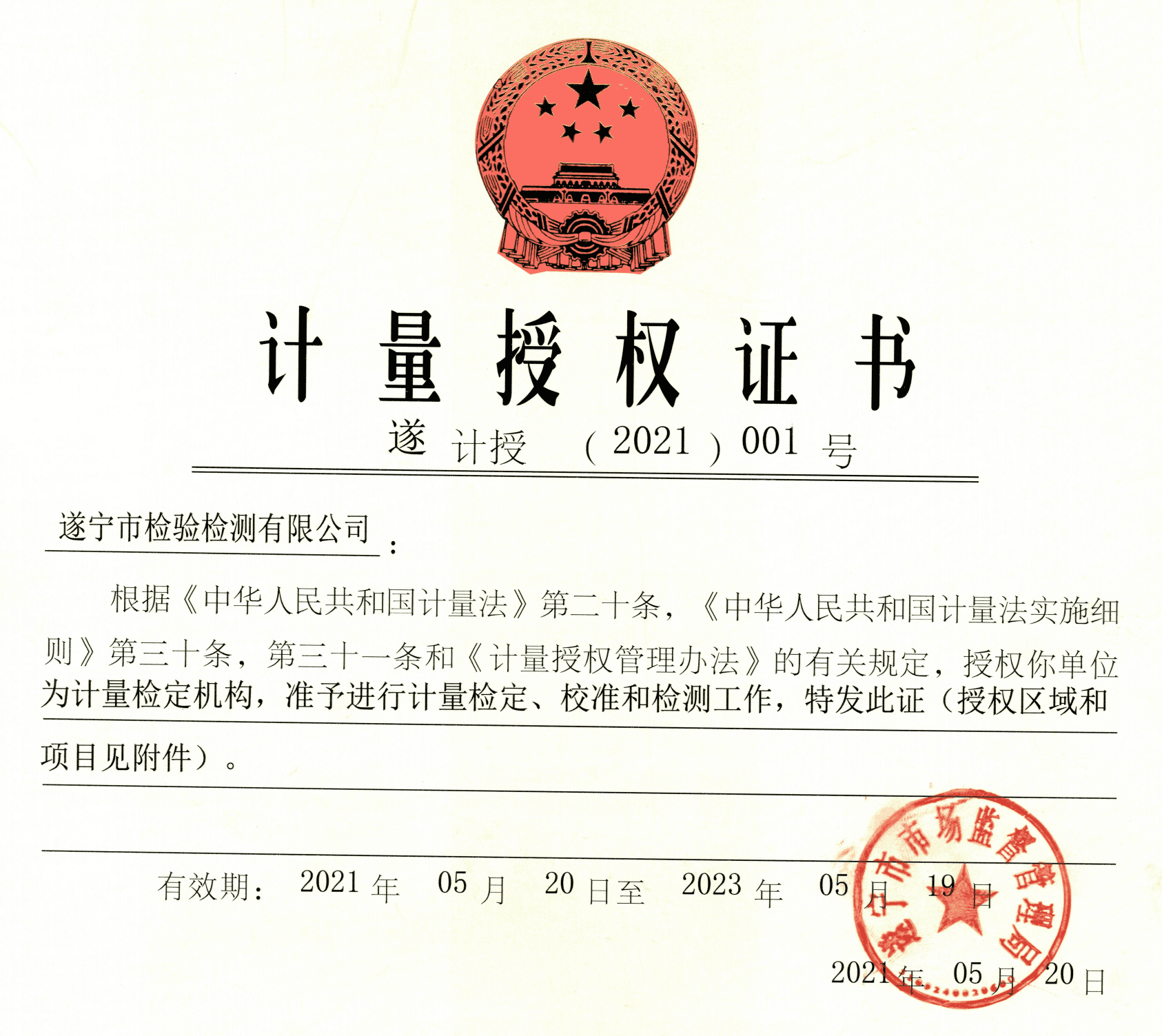 ? ? 近日,遂寧興業(yè)集團直屬企業(yè)市檢驗檢測公司計量檢測中心順利通過遂寧市市場監(jiān)督管理局計量建標(biāo)授權(quán)考核,成功取得“計量授權(quán)證書”。